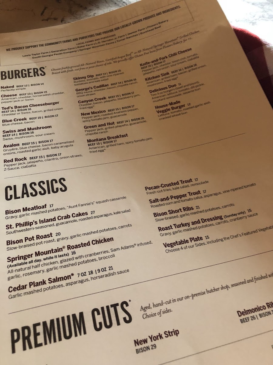Bison or beef burger topped with Cheddar or Swiss, smoky bacon and grilled onions with fresh-cut fries or your choice of side.