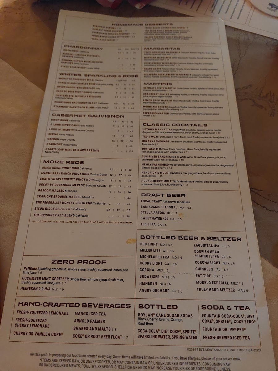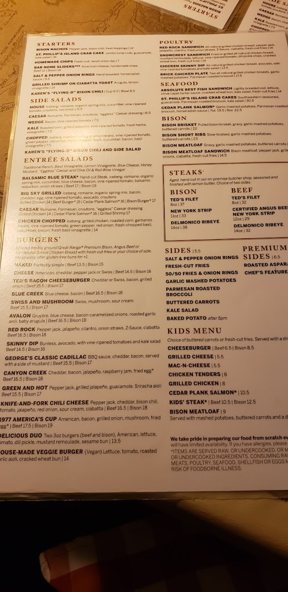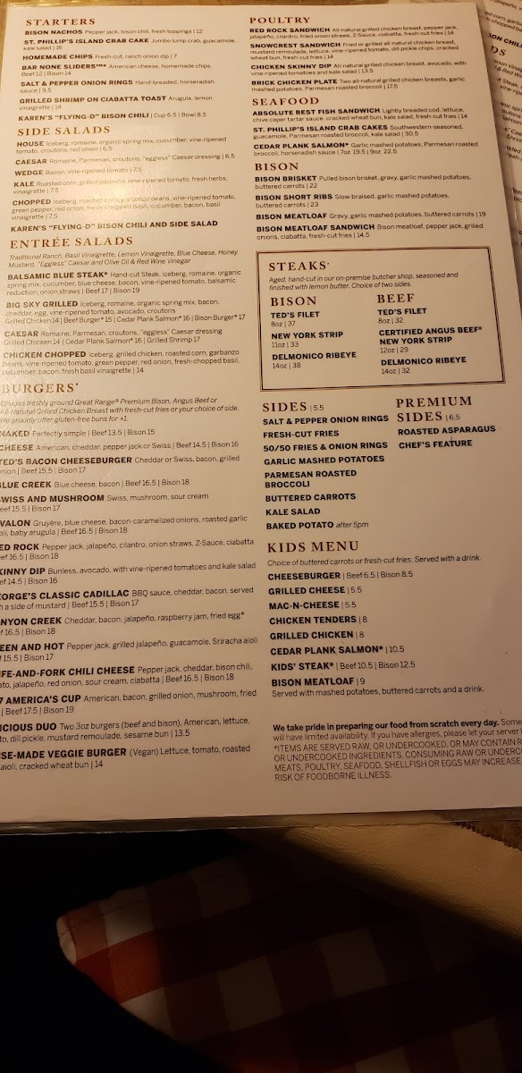 (11oz) Bison New York Strip aged, hand-cut in our on-premise butcher shop, seasoned and finished with lemon butter, choice of two sides.