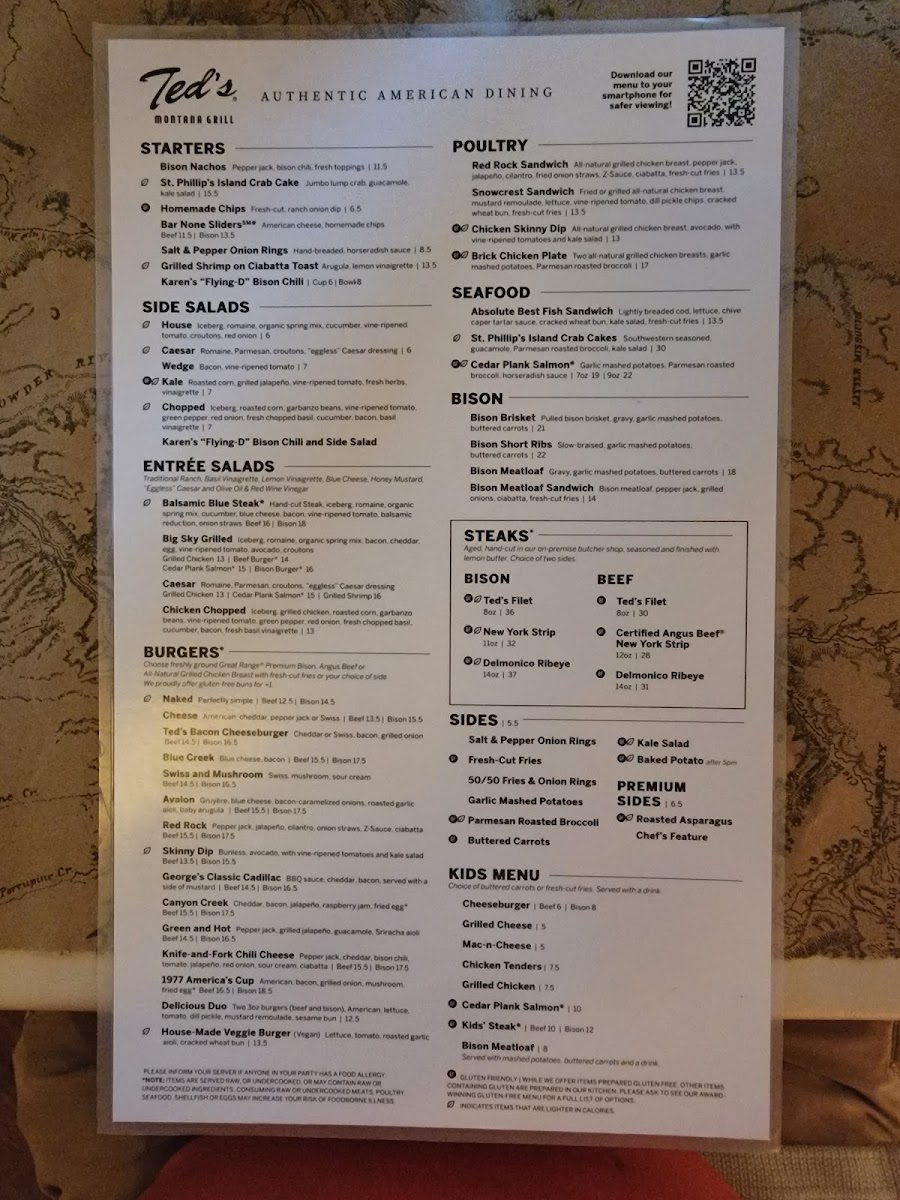 Bison or beef burger topped with pepper jack, jalapeñoes, cilantro, onion straws and Z-sauce served on ciabatta bread with fresh-cut fries or your choice of side.