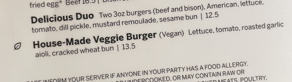 Two 3oz burgers (bison and beef), American cheese, lettuce, tomato, dill pickle, mustard remoulade on a sesame bun, served with fresh-cut fries or your choice of side.